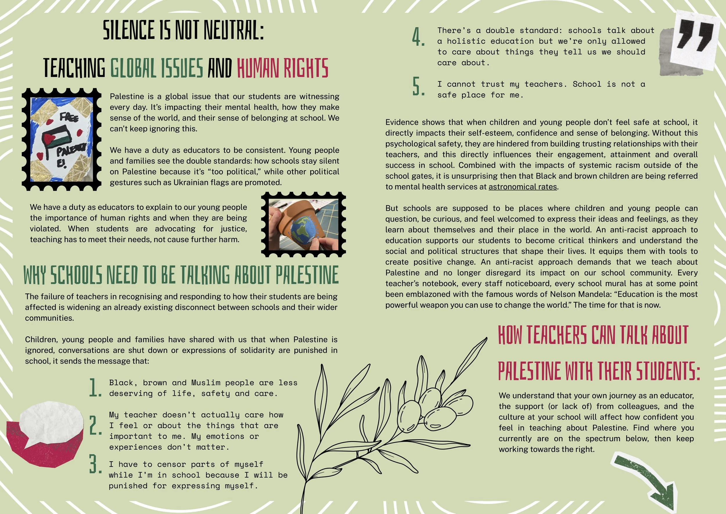 Young people are witnessing human rights violations unfold on their phones, hearing from several humanitarian organisations and news outlets about mass civilian deaths, starvation, and children being bombed in Palestine. But when they come to school grieving, asking questions, and wanting to speak out against injustice, they’re being silenced. They're told that school is not the place for these conversations.