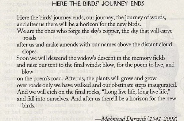 When he passed away on August 9, 2008, newspapers around the world paid tribute to Mahmoud Darwish and his incredible influence as a political poet. More importantly, his life and his work – which had been a primary symbol of the Palestinian cause for at least two generations of Arabs – were celebrated by his people.[16] Darwish received a state funeral in Palestine and is buried in Ramallah.